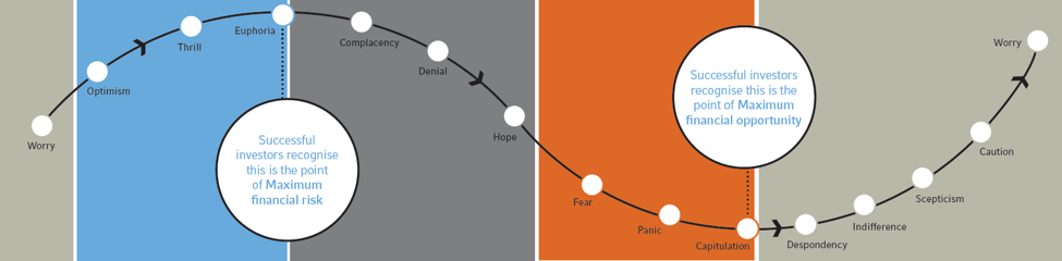 The well-documented “cycle of investor emotions” is based on the principles of behavioural finance. It demonstrates the interplay between the ups and downs of the markets, and the emotions experienced through each phase, such as optimism, euphoria, panic, and despondency. It also highlights the key emotional points where poor decisions are likely to be made.