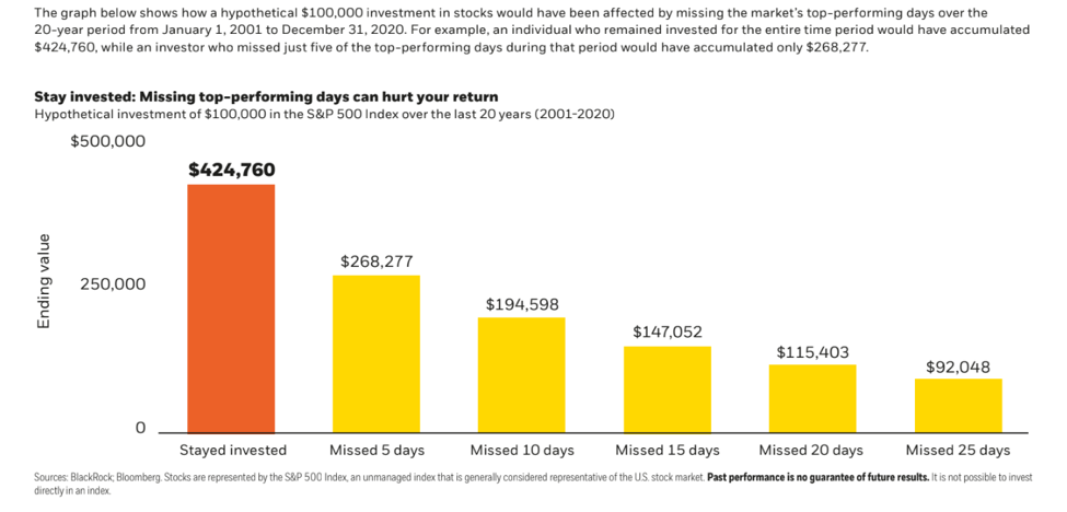 The graph below provides an example of this in practice, showing how a hypothetical investment of $100,000 would have been affected by missing the market’s top-performing days over a 20-year period: